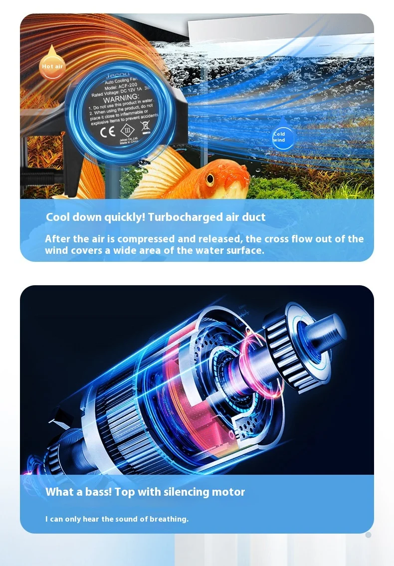 2. Accelerates airflow on the water surface and the evaporative cooling function can cool the aquarium water.